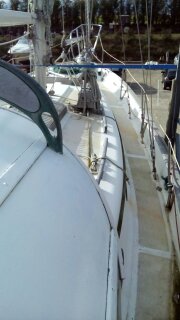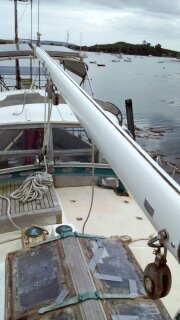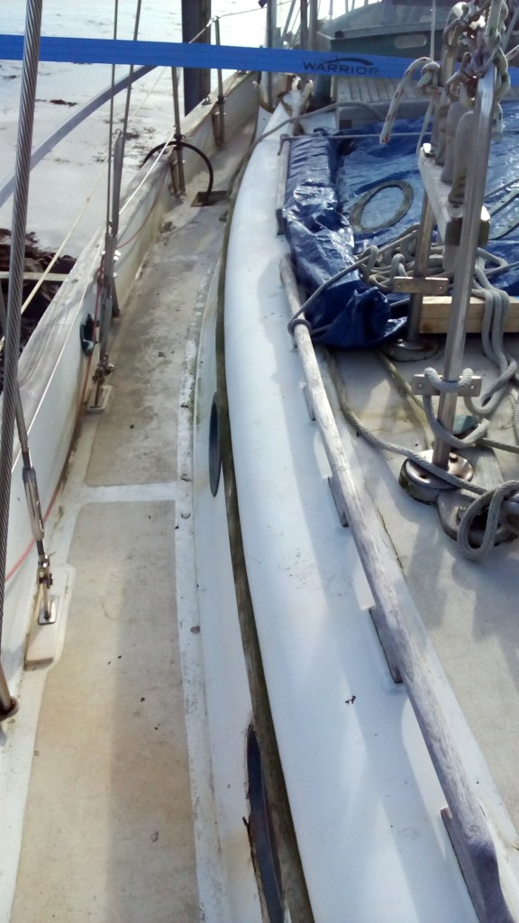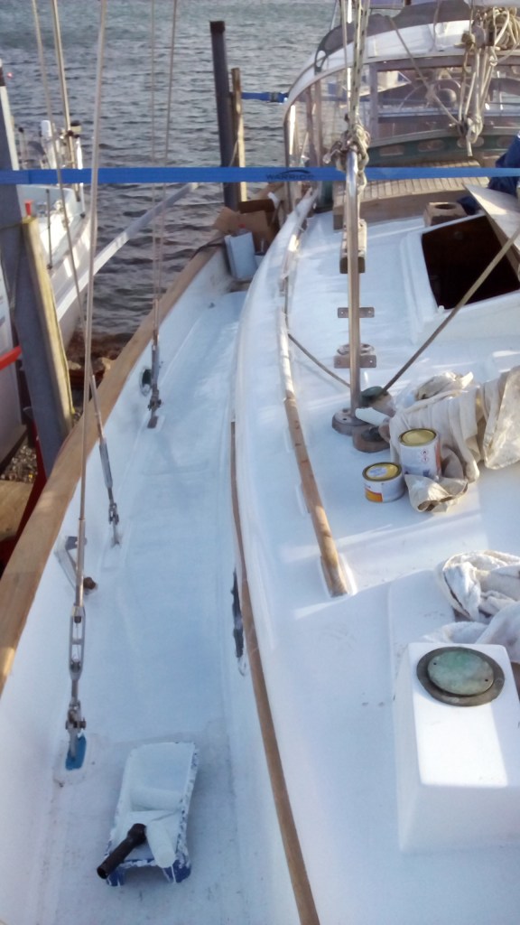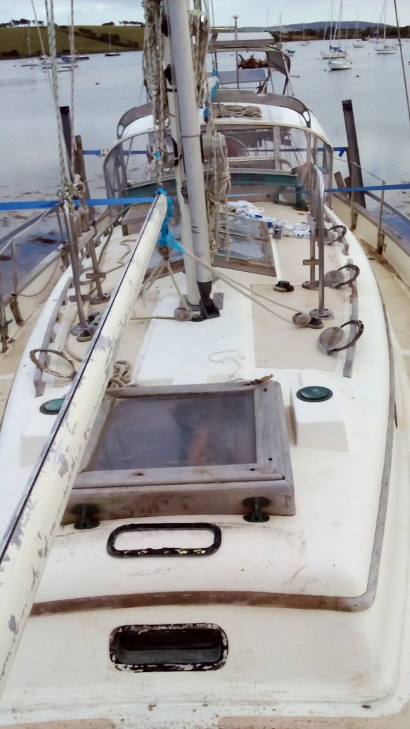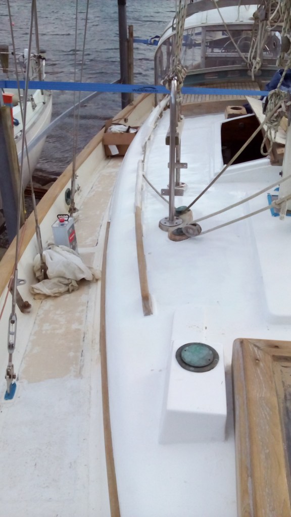 Había que encargarse de la cubierta de la Wahkuna. La madera necesitó ser lijar y protegida con tres capas del Woodskin que dieron a la madera su color dorado. La cubierta requería mucha más atención. Las botavaras fueron pintadas, sacaron los soportes de las lineas de vida, todos los tornillos corroídos y los ojos de buey y las escotillas. Mamá se encargó de descubrir una fuga. Ella selló los ojos de buey, arregló los huecos de la cubierta con fibra de vidrio y polió de nuevo toda la área antes de pintarla de tres capas de pintura. Toda esa parte de la obra duró todo el otoño y finalmente, el 7 diciembre, mis padres terminaron la renovación de la cubierta.