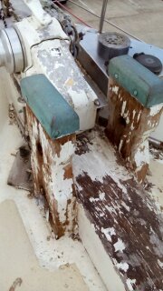 Missing plank on the bowspit.Robert cut the new teak plank.Delphine sanded it.The plank is ready to go.Robert fight with the windlassRobert 1- Windlass 0