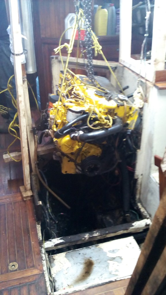 Hoisting the engine out of the bilge after taking apart the galley sink and counterEngine on the saloon floor Time to clean the bilgeThat big hugly pipe in the middle of the bilge took us a week and a few bruised ribs to get out of Wahkuna We got it out !