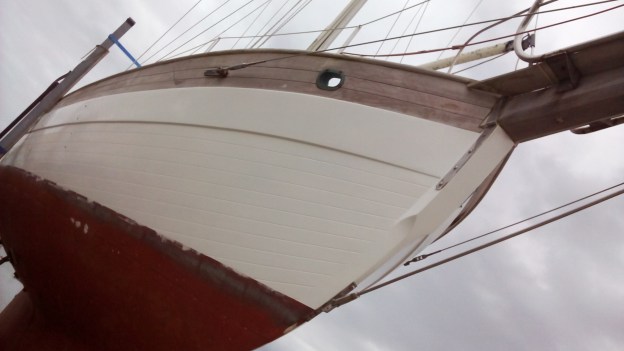 Uno de los proyectos que mis humanos hicieron juntos fue toda la preparación del velero por la capa final de pintura. Eso significó que trabajaron durante una buena semana a pulir el casco para que sea lo más lijo posible. No pudieron dejar ninguna marcas de pintura, ni una burbuja o tampoco pedacitos de polvo en la pintura de base. También tuvieron que proteger toda la madera con papel y cinta de pintura especial y eso también necesitó otra semana más de preparación. Pero por fin, Andy, el Mago, llegó y con algunos golpeos mágicos de su fusil de pintura, transformó a la Wahkuna en una embarcación nueva.