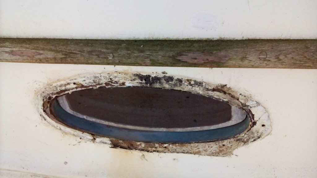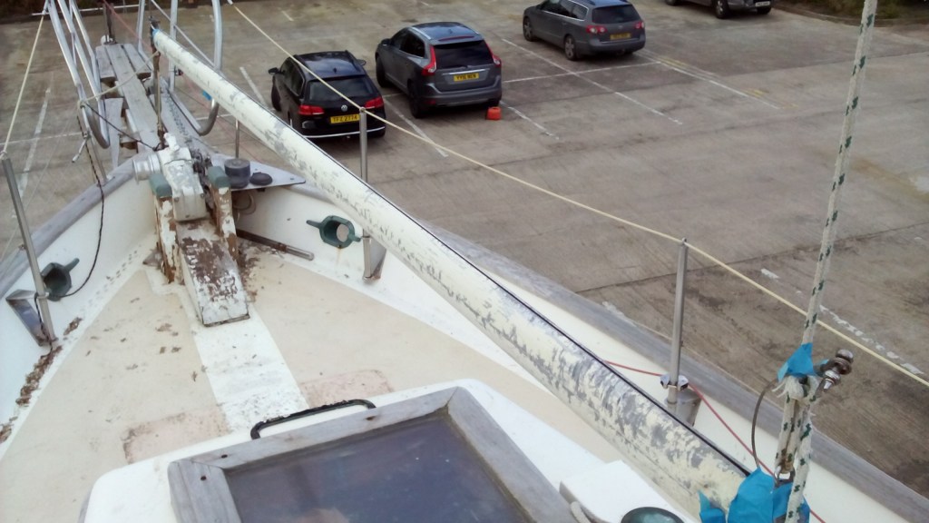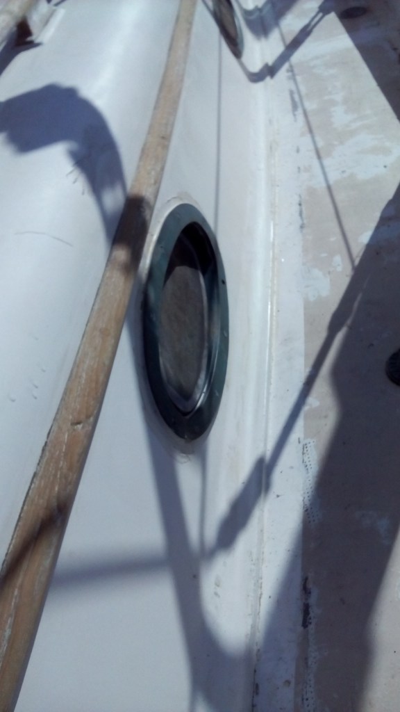 Il a fallu ensuite s’occuper du pont. Là encore il y avait de quoi faire. Le bois avait besoin d’un léger ponçage avant d’être protégé par trois couches de Woodskin pour lui redonner sa belle couleur dorée. Le pont en lui-même avait besoin d’un sérieux ponçage et d’être nettoyé le plus possible. Pour se faire, Papa a enlevé les chandeliers afin de les faire refaire ainsi que la main courante, tous les boulons rouillés et le capot papillon qui avait bien besoin. De son côté, Maman s’est occupé des hublots, commençant ainsi la chasse à une petite fuite que nous avions du mal à localiser. Elle a donc recéler le pourtour des hublots avant de remettre en place ces derniers et de les céler. Avec de la fibre de verre et de la résine d’époxy, elle a bouché quelques petits trous dus à l’usure avant de nouveau de faire chauffer la ponceuse et de finalement recouvrir de trois couches de peinture marine. Tout ce travail sur le pont aura duré tout l’automne et ce n’est que le 7 décembre que mes humains ont enfin finila restoration extérieure du pont.